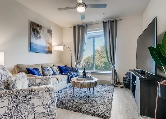 Nestled in the heart of San Antonio, the Luxury Condo Facing Riverwalk offers a unique blend of sophisticated comfort and modern amenities ideal for both leisure travelers and business executives. This pet-friendly haven is centrally located, providing easy access to vibrant local attractions while ensuring a serene retreat from the city's bustle. A mere 2 kilometers from the Southern Pacific Passenger station and 20 kilometers from San Antonio International Airport, the property presents a strategically convenient base for all your travel needs.